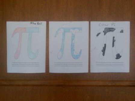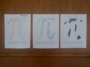 To celebrate, one student produced a slide show with all kinds of interesting information about pi. There was a table to “decorate” Pi — the kids took a copy of the Pi symbol and colored it in (pictured). In addition, there was a short book to read about Pi and a contest to see who could draw the best circle free-handed.  The best part? Homemade pies to eat!